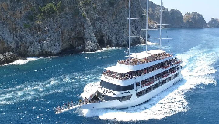 Amazing journey around Alanya coast on the white triple-decker yacht. Enjoy nice lunch, unlimited soft drinks, an animation program, and a foam party on board the biggest yacht in Alanya.
