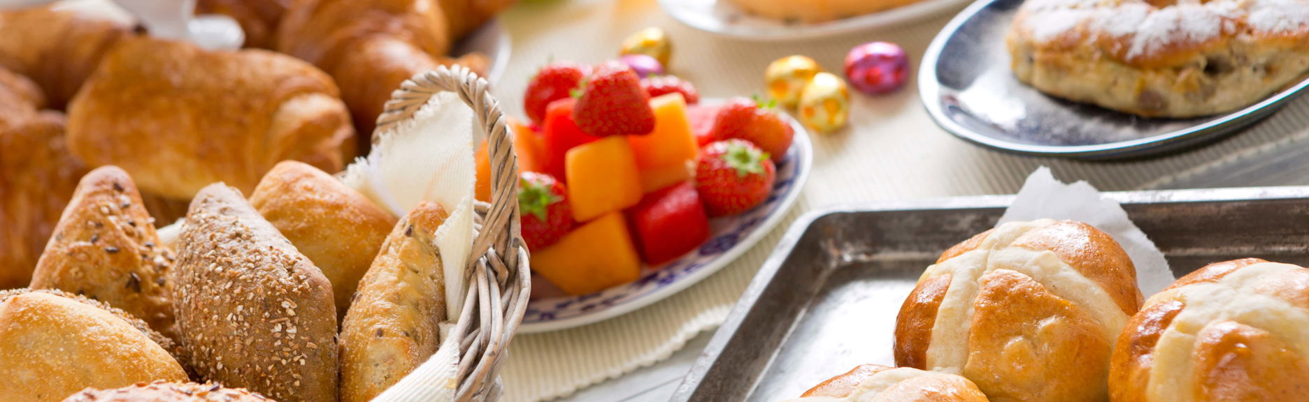 Eggs: scrambled, fried, eggs BenedictSelection of spreads and jams: cottage cheese cream, cream cheese, spicy cream cheese, butter, pink hummus, jam, and honeyVegetables: fresh seasonal vegetablesCheeses: four types of cheeseCold-cut meatsChicken pâtéFruitBakery items: various breads and pastries