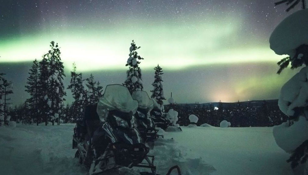 Snowmobiling during beautiful twilight time in the evening provides a different kind of driving experience.