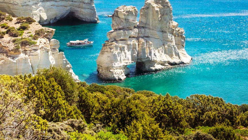 We'll spend four hours sailing along the coast of Milos towards Kleftiko Bay, enjoying the landscapes. On the way, we'll stop at Gerontas beach for about 30 minutes.