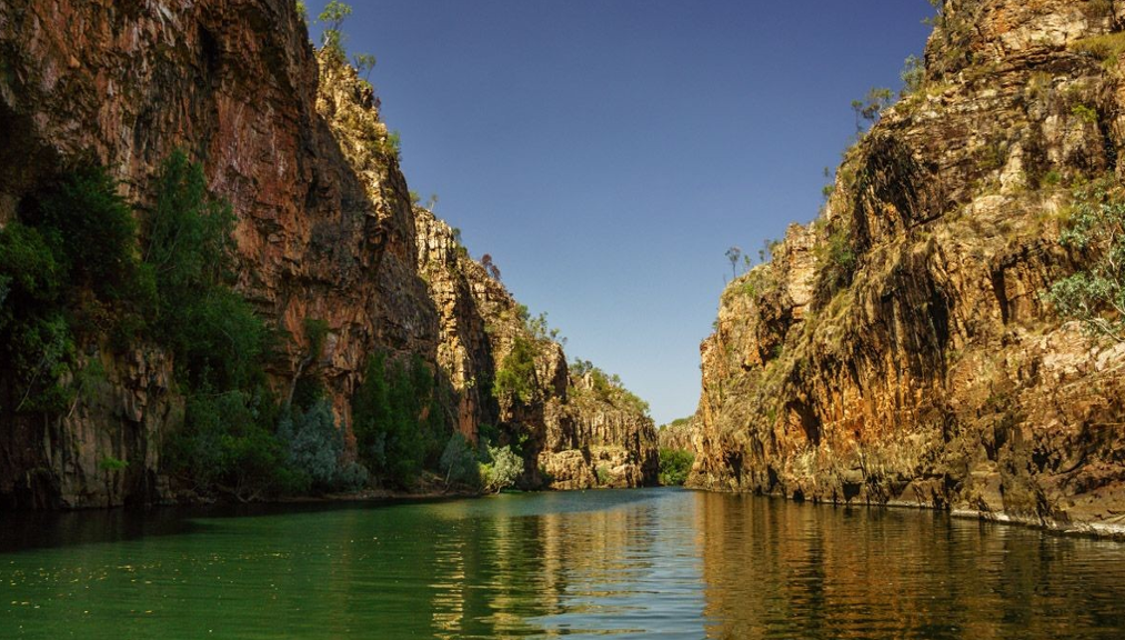 Besuchen Sie die spektakuläre Sandsteinlandschaft des Nitmiluk-Nationalparks und die majestätische Nitmiluk-Schlucht mit ihren Klippen, die im wechselnden Licht erstrahlen.