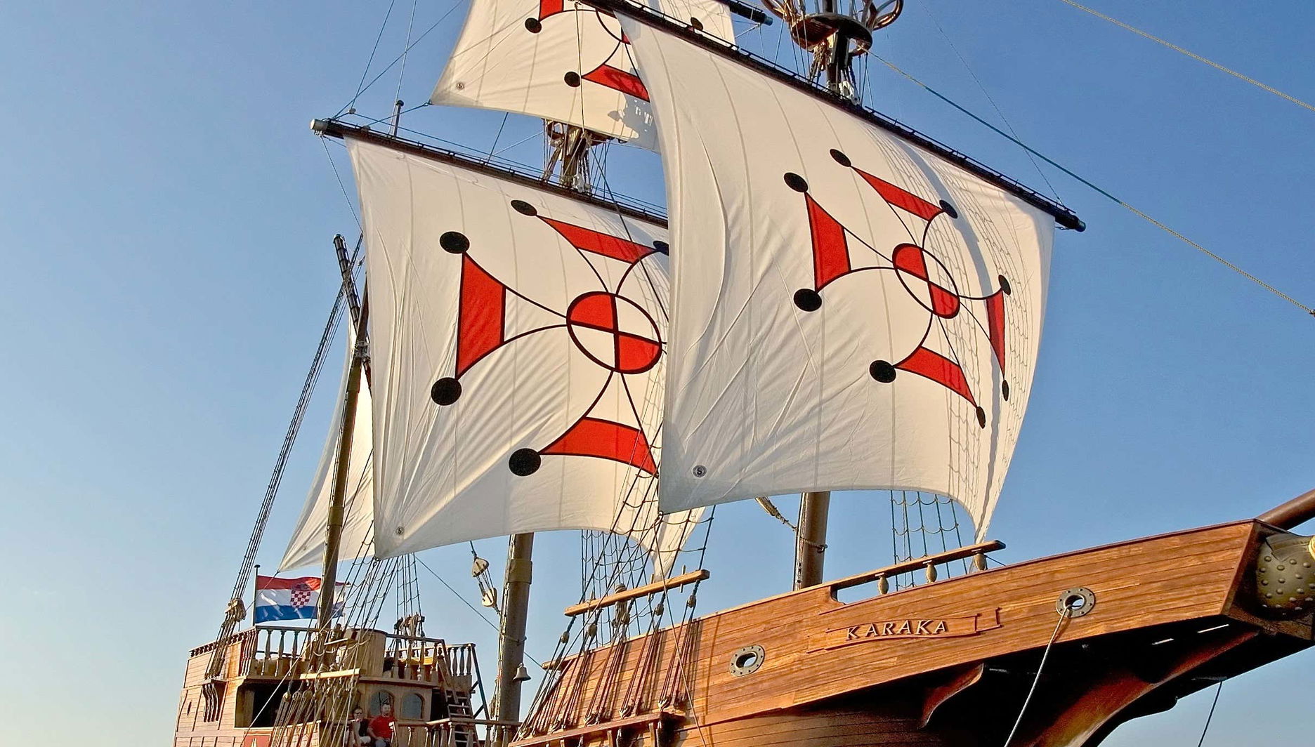 À l'heure convenue, vous serez pris en charge à votre hôtel ou nous vous retrouverons au port de Gruž, selon votre choix lors de la réservation. Vous monterez à bord du Karaka, un majestueux bateau de cette croisière : une réplique détaillée d'un vieux galion, un grand navire à voiles armé. Grâce à ce genre de bateau, la République de Raguse a réussi à rivaliser avec Venise pour le contrôle marchand de la mer Méditerranée.