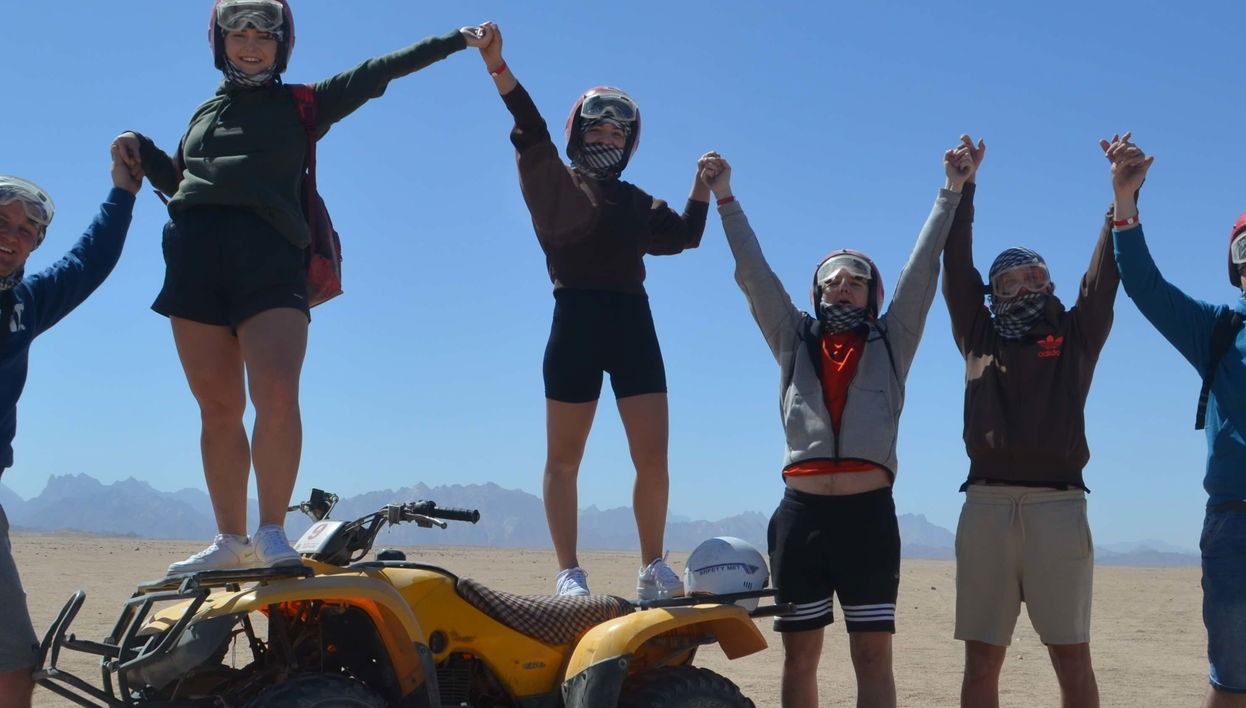 At a time of your choice, you'll be picked up from your hotel in Hurghada and set off into the Egyptian desert. Once we arrive at the desert camp, you'll ride a quad bike for 45 minutes through the arid landscapes and drive a buggy for 20 minutes. Following this, we'll head to a Bedouin camp for typical tea and traditional bread while watching the sunset and learning about Bedouin culture. The next activity includes a camel ride in the desert. Afterward, you'll enjoy a traditional Bedouin dinner accompanied by a show of oriental dances. Finally, you'll be driven back to your hotel in Hurghada, arriving 7 hours after pickup.
