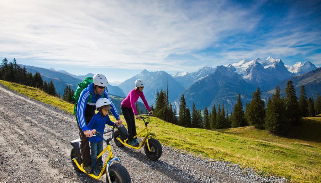 Monster Scooter sind eine unterhaltsame Möglichkeit, die Schweizer Berglandschaft mit der ganzen Familie zu erkunden.
