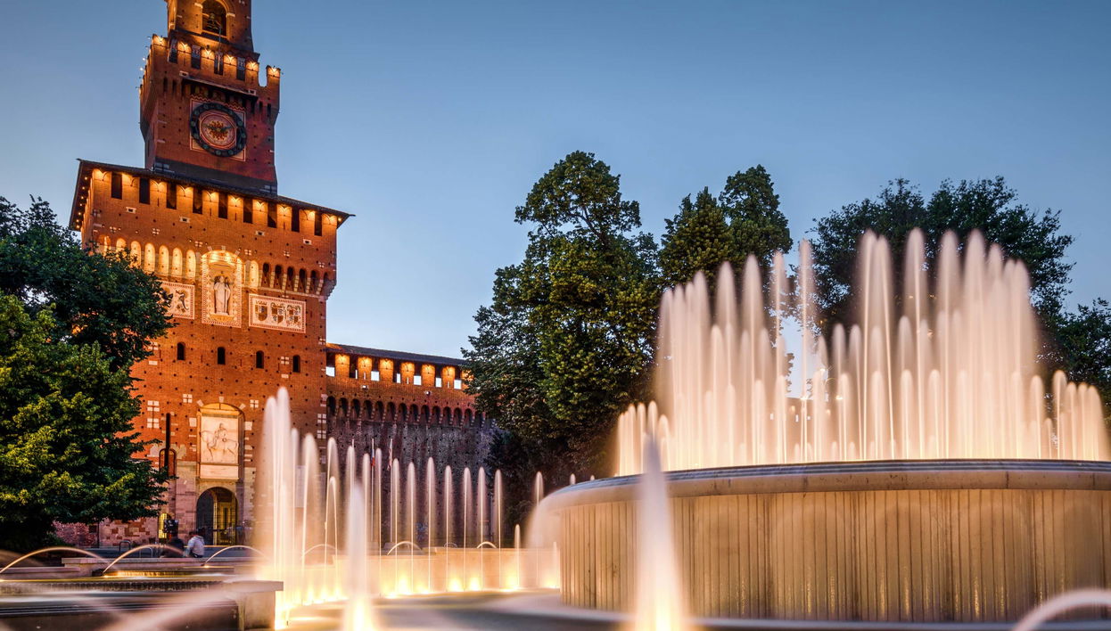 We'll start this tour by looking at the courtyards of Castello Sforzesco, one of the most important monuments of the Lombard capital. The last rays of sunlight will gradually tint the exterior of this fortress and its surroundings.