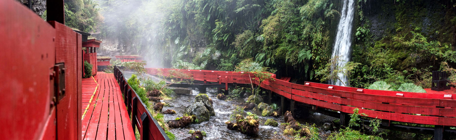 Vous pourrez flâner le long des passerelles adjacent aux thermes, permettant ainsi d'admirer la disposition géométrique des bassins tout en profitant du splendide cadre naturel environnant. Le complexe s'intègre harmonieusement dans une vaste zone préservée, où vous aurez l'occasion d'observer une charmante forêt vierge, un ruisseau apaisant et une cascade qui alimente les thermes.
