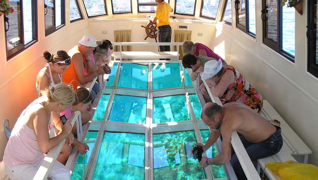 Naviguez sur les eaux azurées à bord d'un bateau à fond de verre et émerveillez-vous devant la vie marine vibrante qui se trouve en dessous.