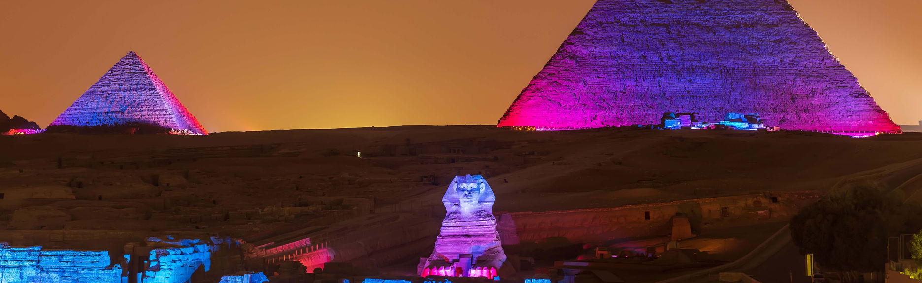 Ritrovo a Il Cairo nel vostro hotel per dirigervi al complesso archeologico delle Piramidi di Giza. Partecipazione a uno spettacolo di luci e suoni della durata di circa un'ora, con proiezioni sui principali monumenti. La Grande Sfinge e le piramidi di Cheope, Chefren e Micerino verranno illuminate, raccontando la storia del sito, Patrimonio dell'Umanità, con accompagnamento musicale. Al termine dello spettacolo, ritorno in hotel.