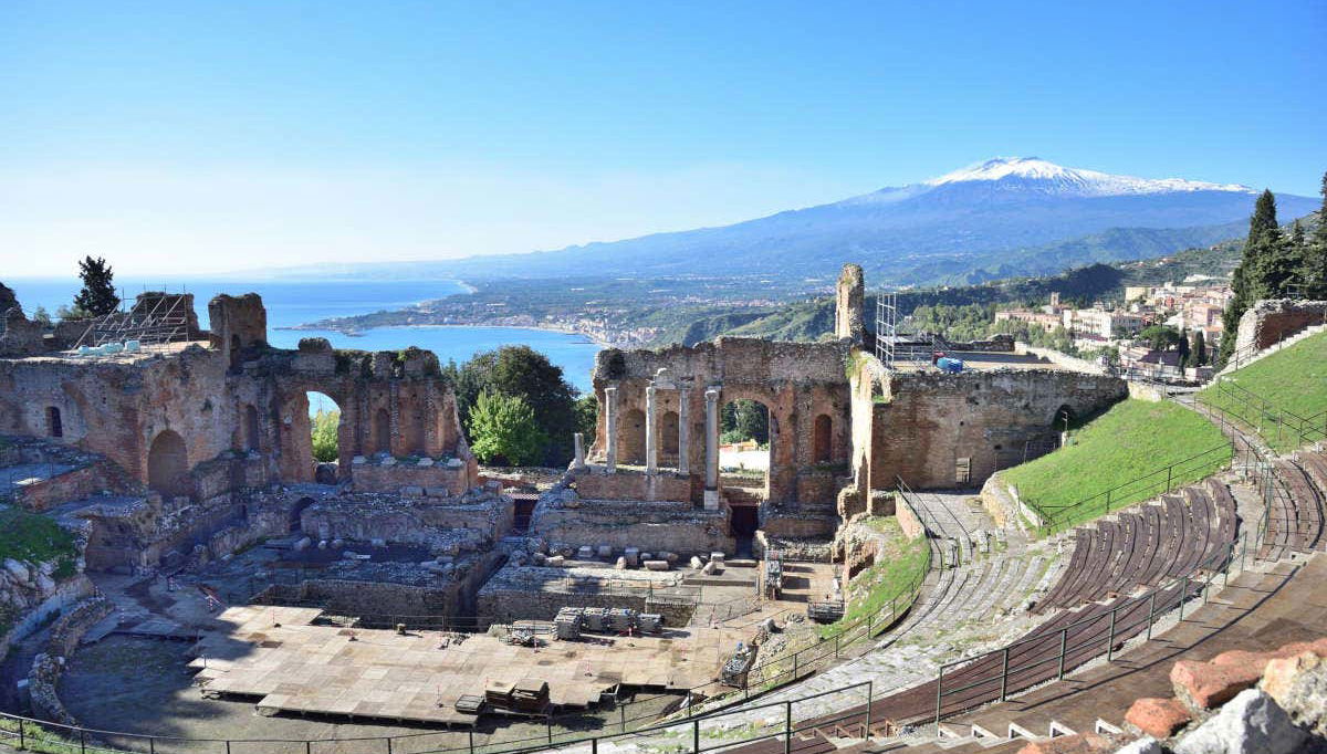 Visiteremo anche il teatro greco-romano di Taormina, da cui si gode di una vista sull'Etna.