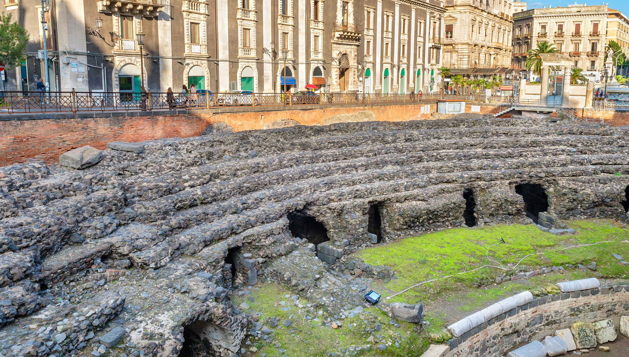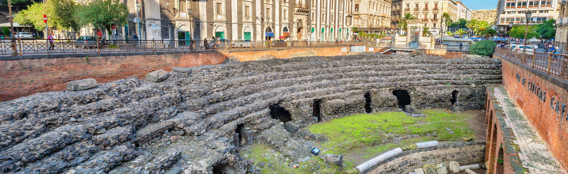 Nossa primeira parada será o Anfiteatro Romano, um importante monumento do séc. II d.C., localizado dentro do parque arqueológico greco-romano de Catânia.