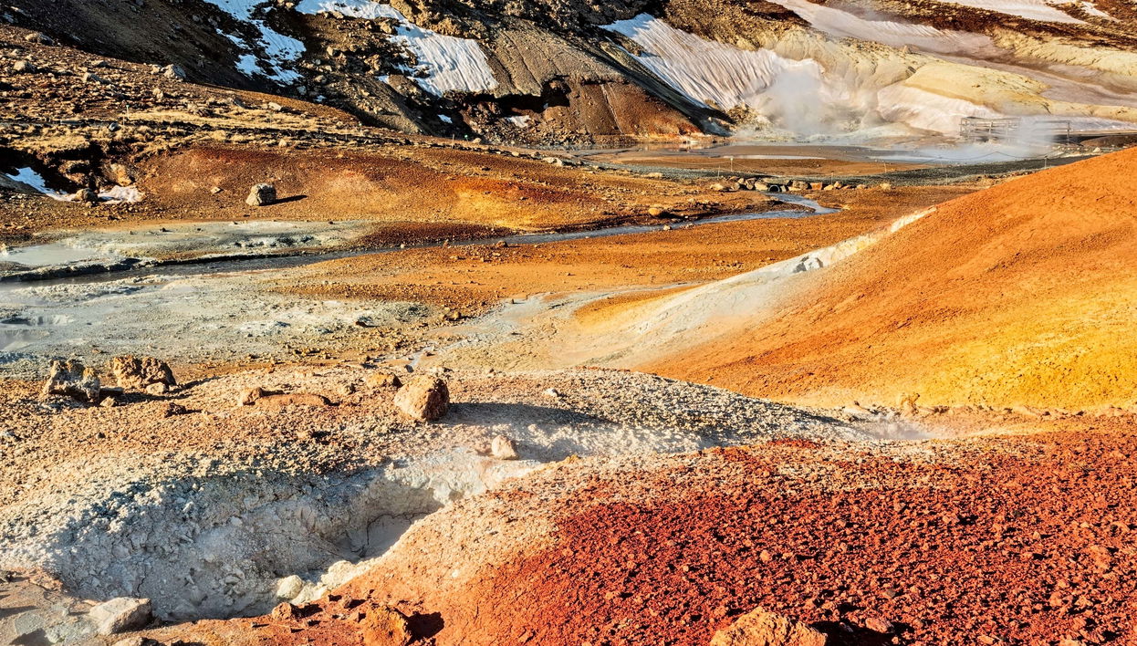 Após ser buscado no seu hotel em Reykjavík entre 8:30 e 9:00 horas, começaremos a excursão à península de Reykjanes, uma área natural no sudoeste da Islândia. As paisagens impressionam desde o início. A primeira parada será no lago Kleifarvatn, famoso pela lenda de uma grande serpente em suas águas. A rota prossegue para a região geotérmica de Krýsuvík, rica em crateras vulcânicas criadas pela explosão das águas subterrâneas. Visitaremos também o lago Grænavatn, de águas verdes, resultantes de erupções. Em seguida, faremos uma parada na cidade costeira de Valhnukar, conhecida pela avifauna em seus penhascos. Nas proximidades, está o farol Reykjanesviti, o mais antigo da Ilha. A última parada será a ponte entre dois continentes, sobre a placa tectônica da América do Norte e da Eurásia. Concluiremos a excursão com o retorno a Reykjavík às 14:30 horas.